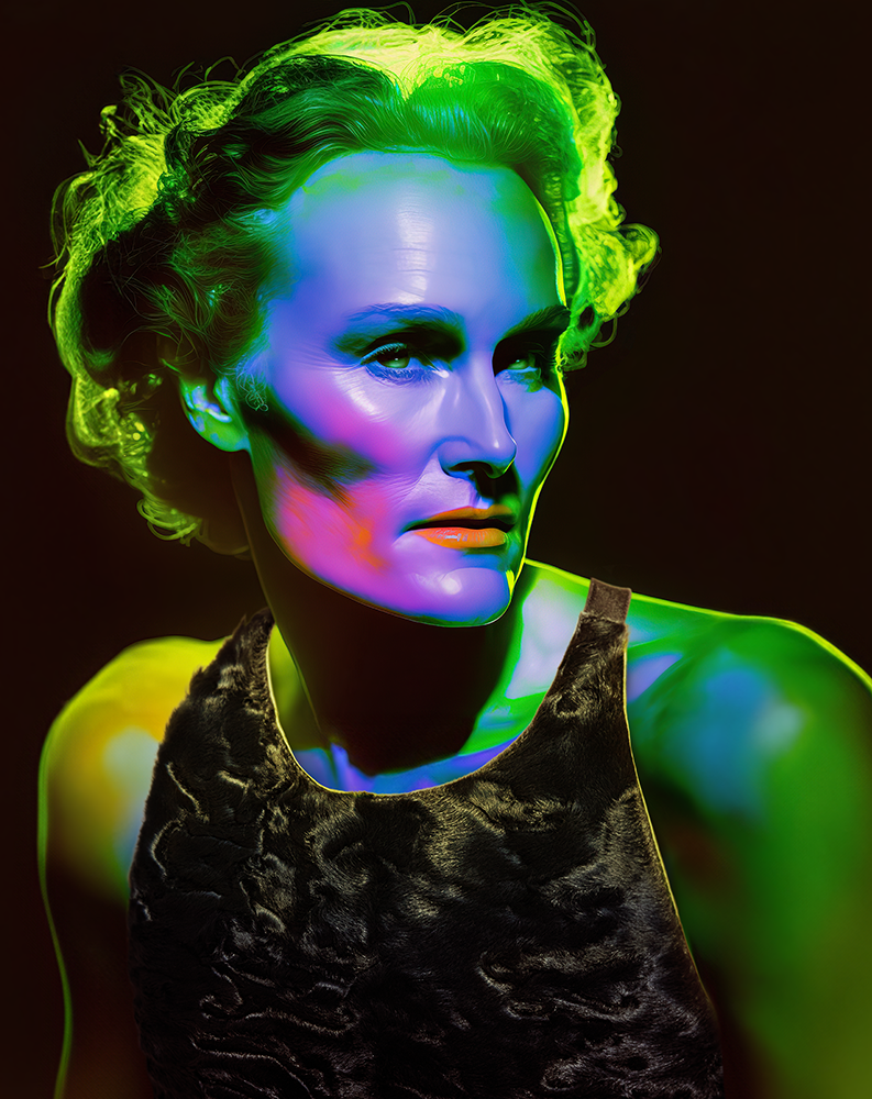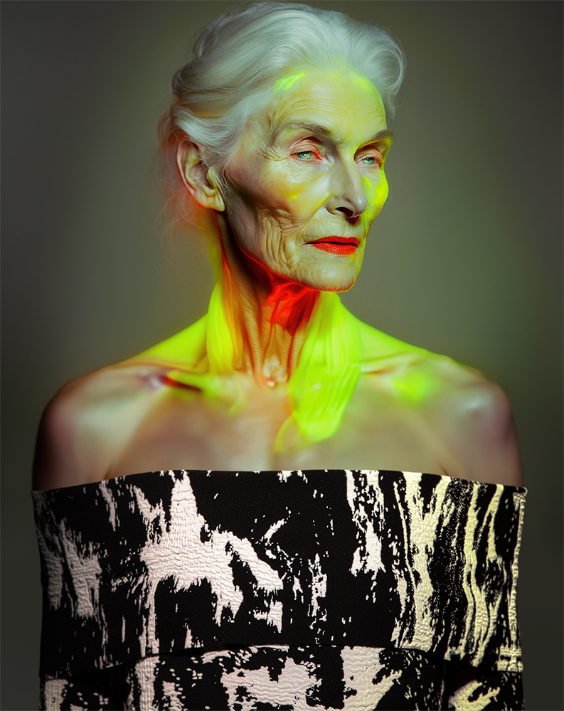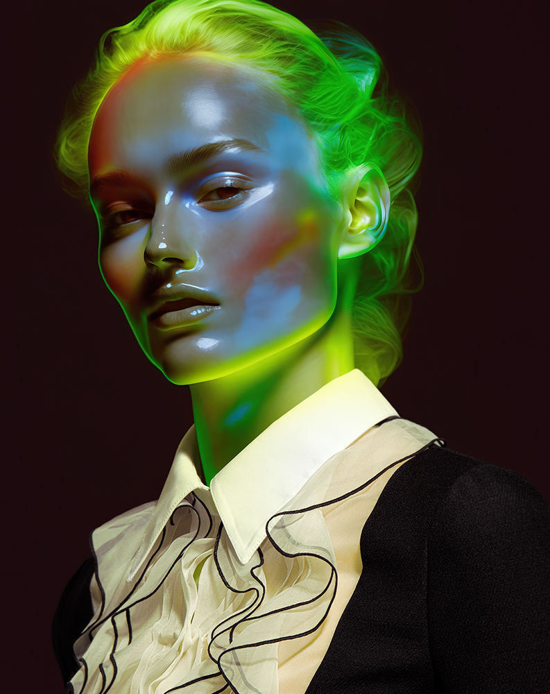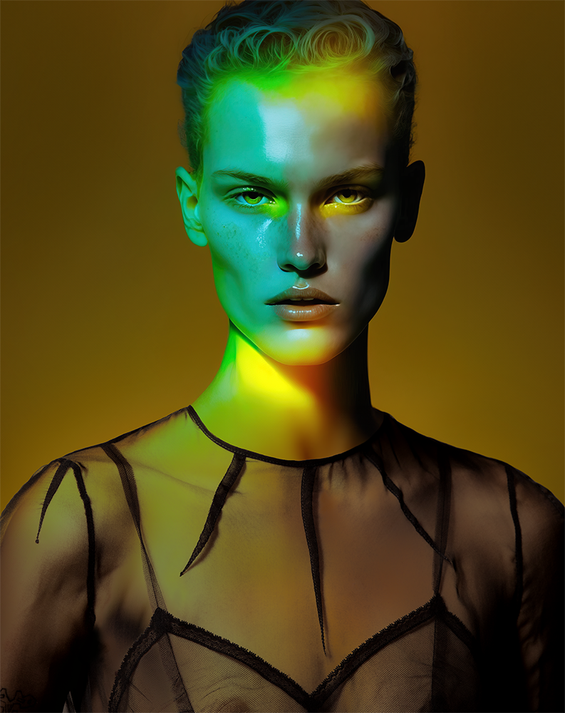 The skins and hair of these models are not painted or covered in make up. They glow of multiple colours from the inside, as if their own bodies were born this way, radiating colour and energy from within.