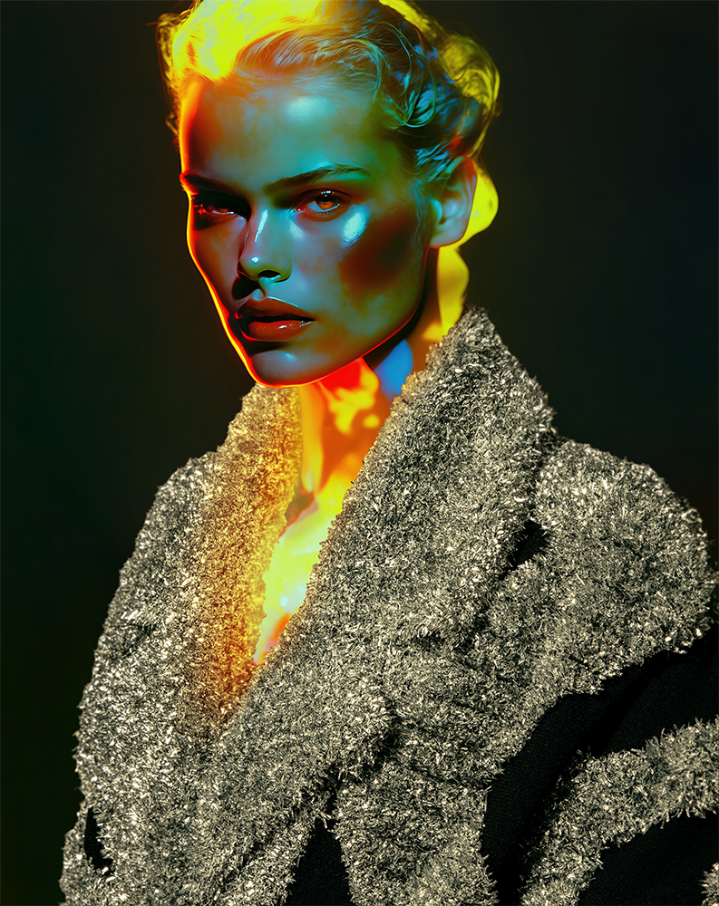 A.i. generated models wearing real clothes. The concept behind this winter 2024 editorial was to create extremely detailed and realistic women, but with enough few elements which would distance them from reality: light and colour.