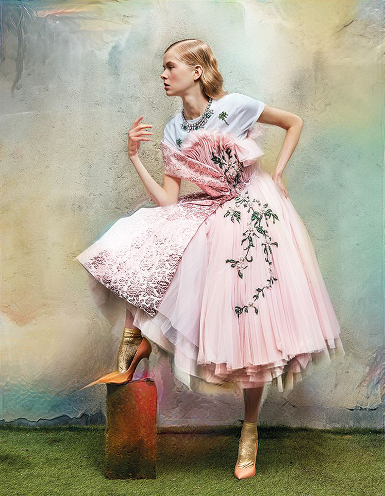 Each photograph has been re-designed by A.i., fusing techniques of photography and painting, resulting in a delicate blur between real and abstract representations of fashion iconography.